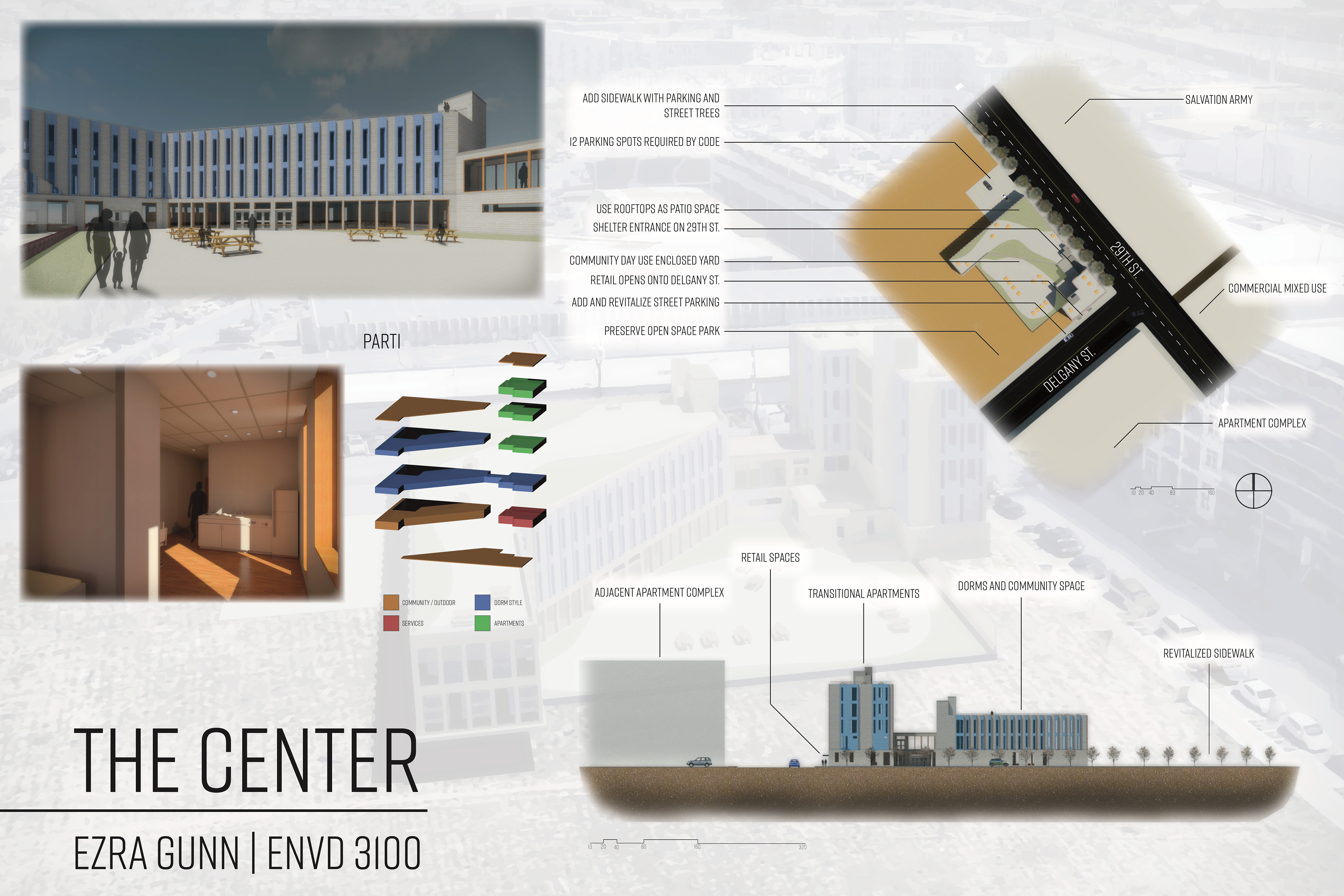 The Center is a progressive homeless shelter located in Denvers RiNo neighborhood that focuses on moving residents through the building, first to an emergency dorm, then to a long term dorm, and then finally to onsite micro-apartments.